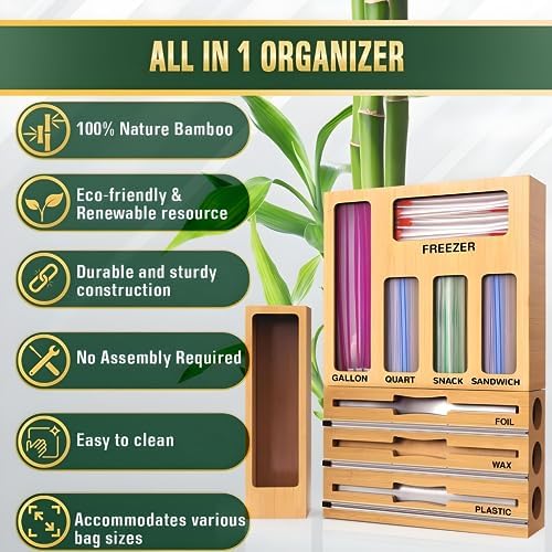EFFORTLESS SETUP & EASY TO USE – Our ziplock bag organizer is designed for hassle-free use, requiring no assembly. Each slot in the dispenser features stylishly wrap names, allowing you to easily identify the contents at a glance. Additionally, our aluminum foil dispenser comes fully assembled as a single-piece box with 3 slots, accompanied by 5 storage bag organizers.