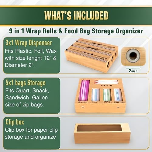 SIMPLIFY KITCHEN STORAGE – Discover the perfect kitchen storage solution with our all-in-one set! Effortlessly organize with our 3-in-1 foil and wrap dispenser, accommodating foil, plastic wrap, and wax paper (up to 12″ x 2.2″). Our 5-in-1 baggie organizer fits various sizes and brands. Complete your tidy kitchen with the bonus storage box for clips and small items.
