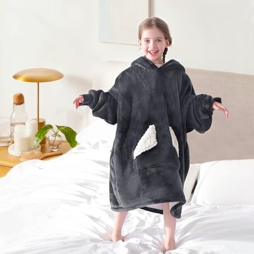Touchat Wearable Blanket Hoodie, Oversized Sherpa Blanket Sweatshirt with Hood Pocket and Sleeves, Super Soft Warm Plush Hooded Blanket for Kids, One Size Fits All (Grey)
