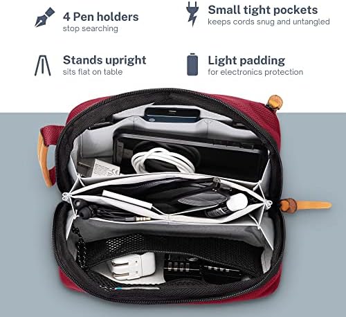 TRIPPED Travel Gear Tech Bag Organizer – Small Electronics Organizer Pouch for Travel – Premium Travel Case with Leather Accents – Mesh Pocket for Cables, Cords and Chargers (Red)