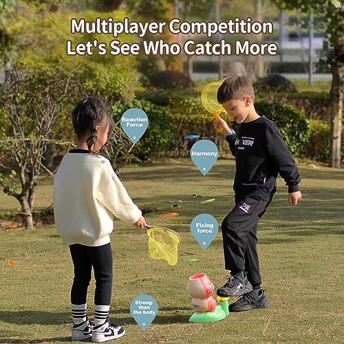 🐸【Indoor and Outdoor Game Toys】the disc toy set includes 1 launcher, 8 discs(2 are fluorescent), 4 catching nets, and 4 safety goggles to support multiple players. Comprising perfect interactive toy kid, parents, and even your pets can compete and enjoy quality time while improving their agility and hand-eye coordination.