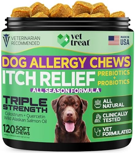 Vet Treat Dog Allergy Chews – Itch Relief for Dogs – Dog Allergy Relief – Anti Itch for Dogs – Dog Itchy Skin – Dog Allergy Support – Hot Spots – Immune Health Supplement – Made in USA – 120 Treats